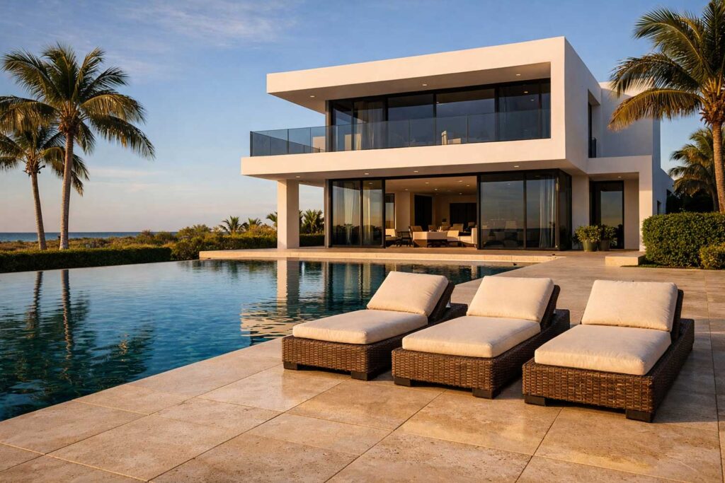 A contemporary oceanfront villa offering panoramic sea views, open living spaces, refined architectural.